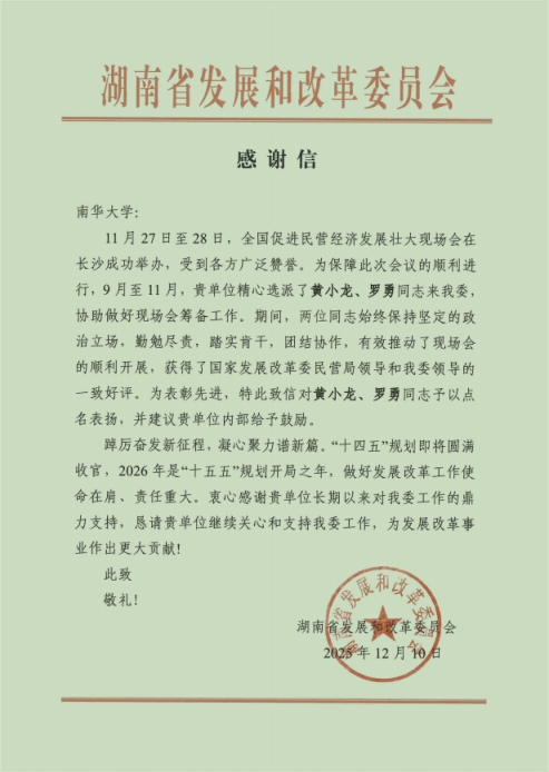 近日,南华大学收到来自湖南省发展和改革委员会的感谢信。信中强调,南华大学教师黄小龙、研究生罗勇作为全国促进民营经济发展壮大现场会的筹备人员,在协助做好现场会筹备工作中保持坚定的政治立场,勤勉尽责,踏实肯干,团结协作,有效推动了现场会的顺利开展,获得了国家发展改革委民营局领导和湖南省发展和改革委员会领导的一致好评。