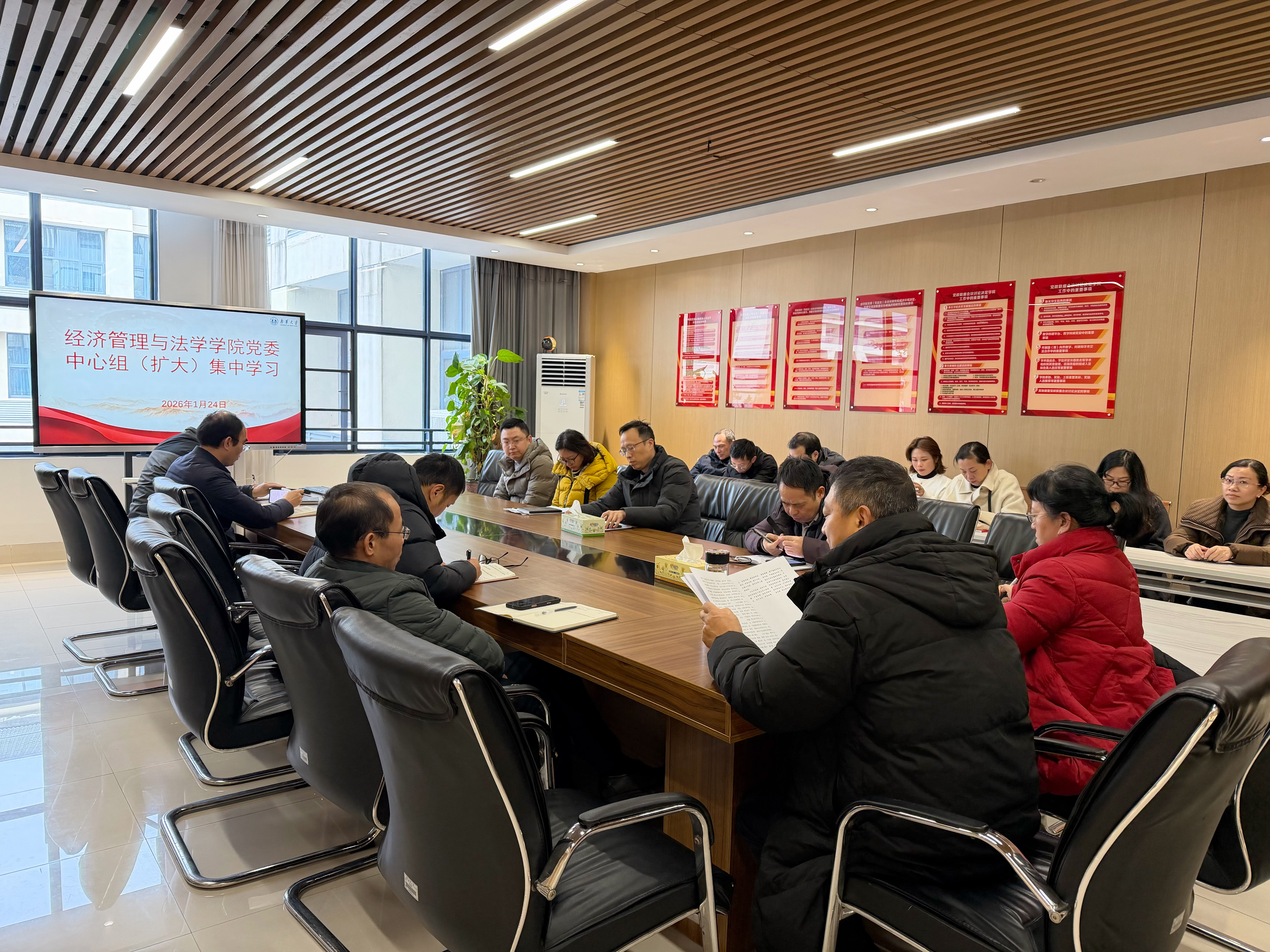 1月25日下午,经济管理与法学学院党委在崇义楼308会议室举行1月理论学习中心组(扩大)集中学习暨第1次教职工理论学习活动。学习主题为“深入学习贯彻习近平新时代中国特色社会主义思想和党的二十届四中全会精神,认真贯彻习近平总书记关于党的建设的重要思想、关于党的自我革命的重要思想以及关于加强党的纪律建设、作风建设的重要论述、关于教育的重要论述、关于巡视工作的重要论述等,为高质量开好2025年度民主生活会打牢思想基础。”