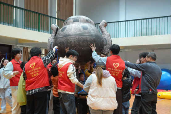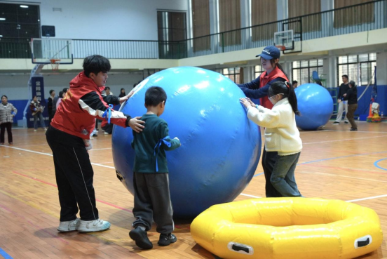 随后,志愿者以孩子们熟悉的哪吒故事为切入点,精心设计了“传递乾坤圈”“推动充气灵珠球”“抬起充气火焰球”等趣味互动挑战。游戏过程中,孩子们逐渐打开心扉,主动与志愿者携手合作,共同完成各项任务。一个个专注的眼神、一次次成功的击掌,是这场志愿行动最温暖的注脚,也见证着青春力量与特殊群体之间真情交融的美好时刻。
